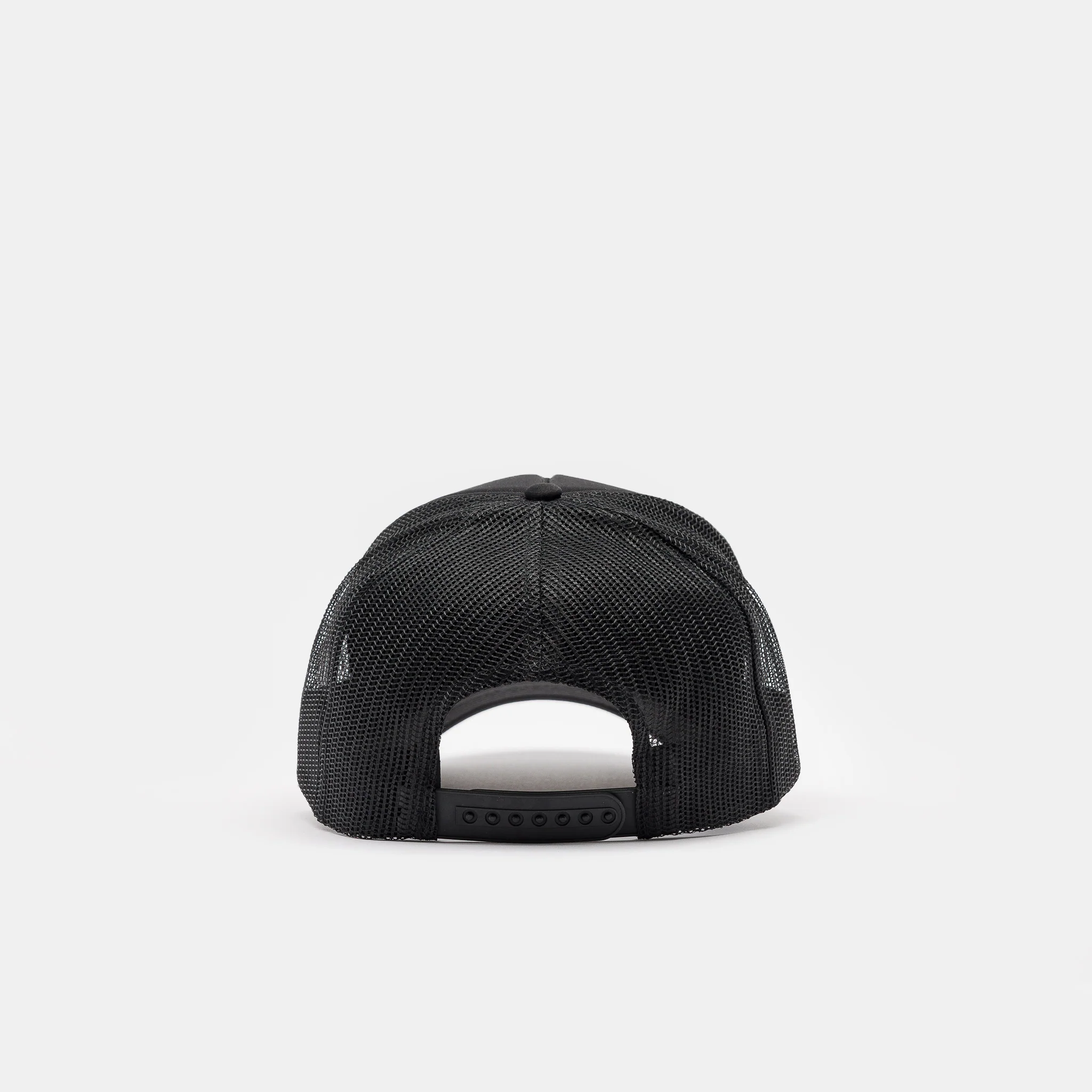 Todo Pasa trucker cap in black. Features distressed brim, printed logo on the front, and plastic snapback.