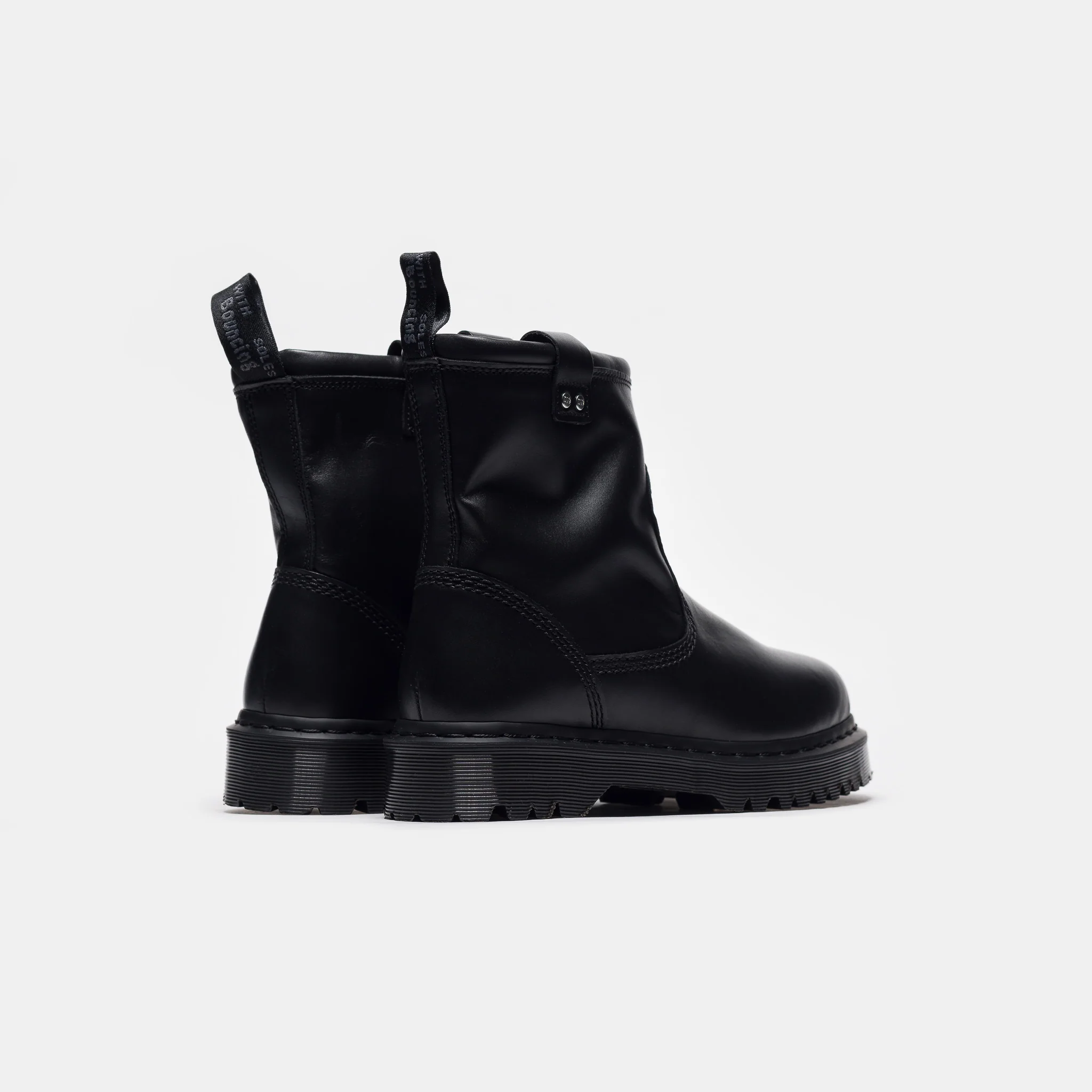 Dr. Martens unisex Anistone Lo Leather Biker Boot in Black. Features durable soft leather upper, back pull tab, and padded collar.