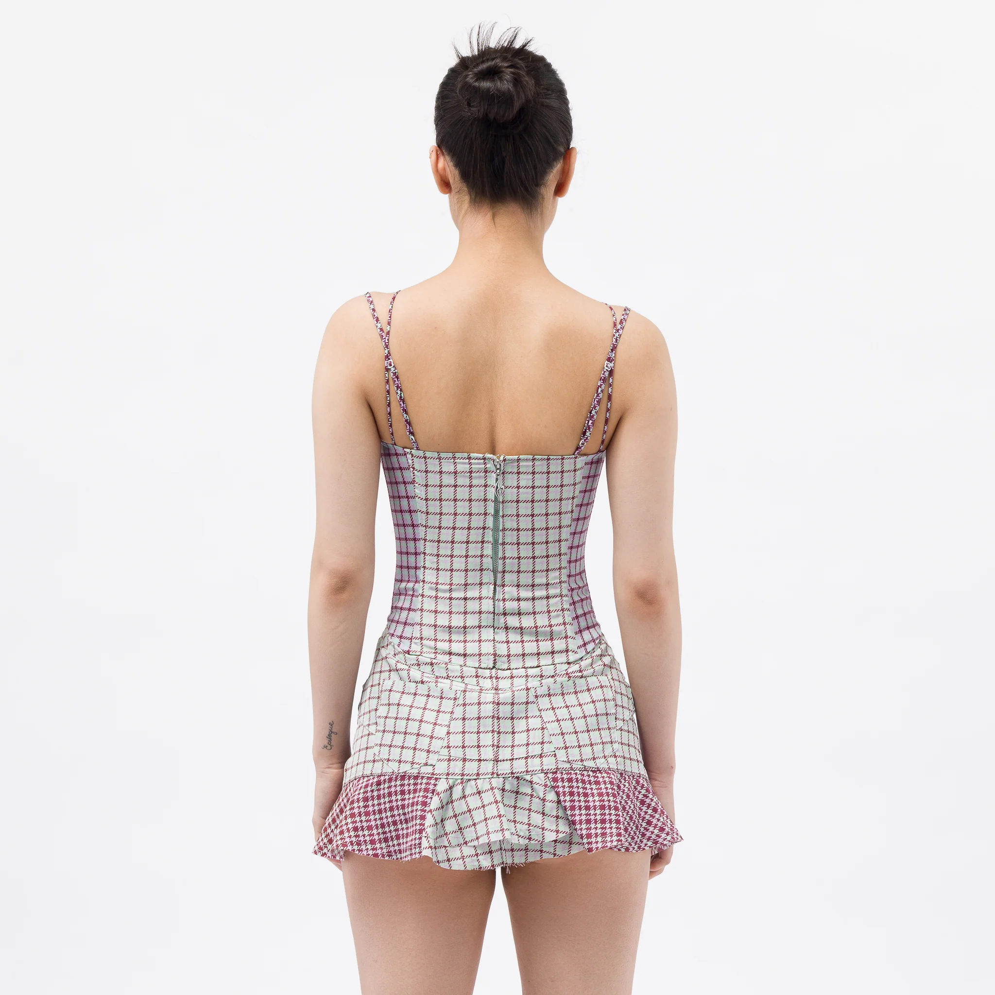 Miaou women’s standard fit “Bristol Plaid” multicolor houndstooth plaid printed silk corset top. Features a corset body with boning and built in underwire, criss-cross neck straps, and a zipper back with a Hannah Jewett zipper pull. Constructed using deadstock fabric.