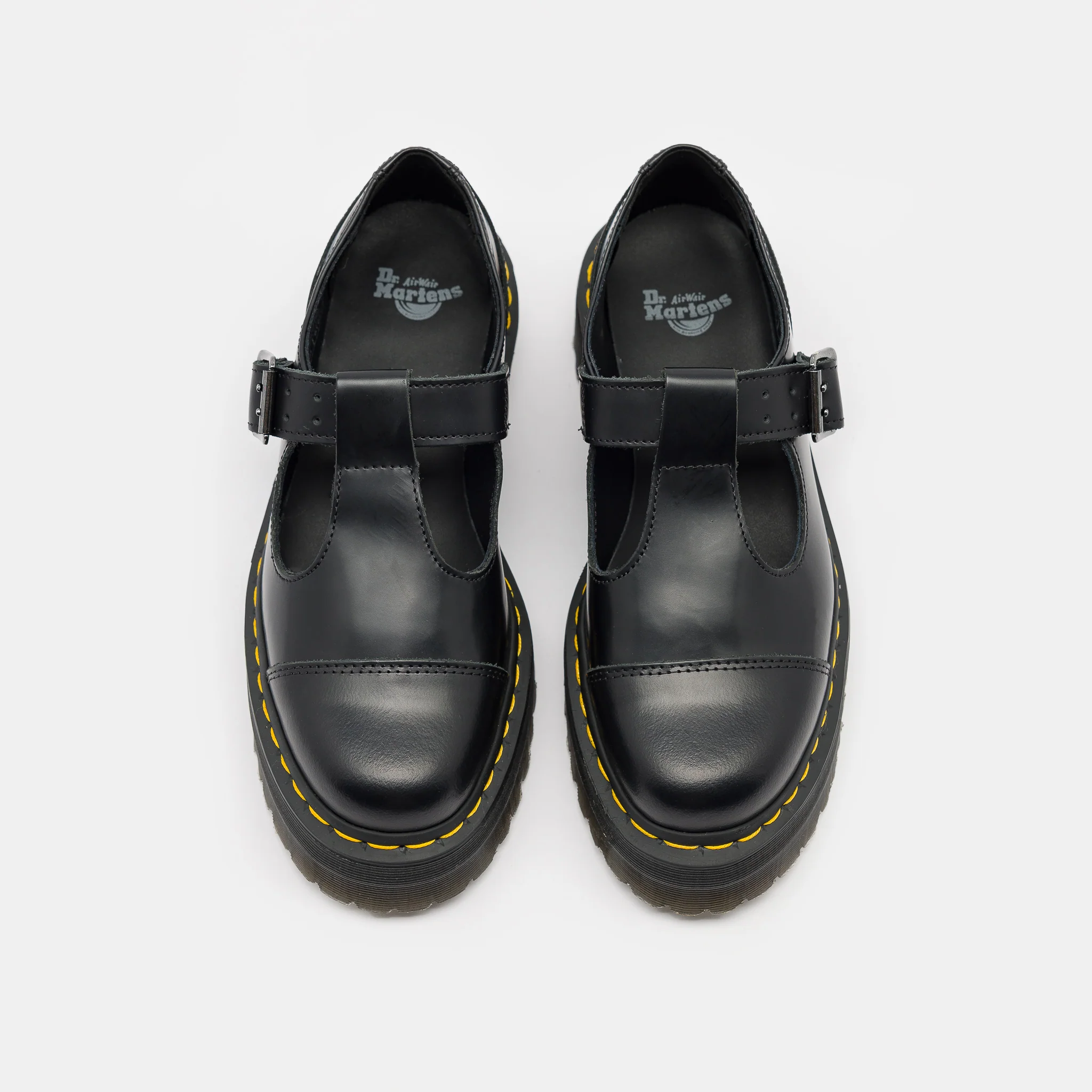 Dr. Martens women’s limited edition standard fit black leather mary jane shoe. Features an adjustable top buckle strap, signature yellow stitching, and Dr. Martens' signature Goodyear welted platform AirWair cushioned rubber sole.