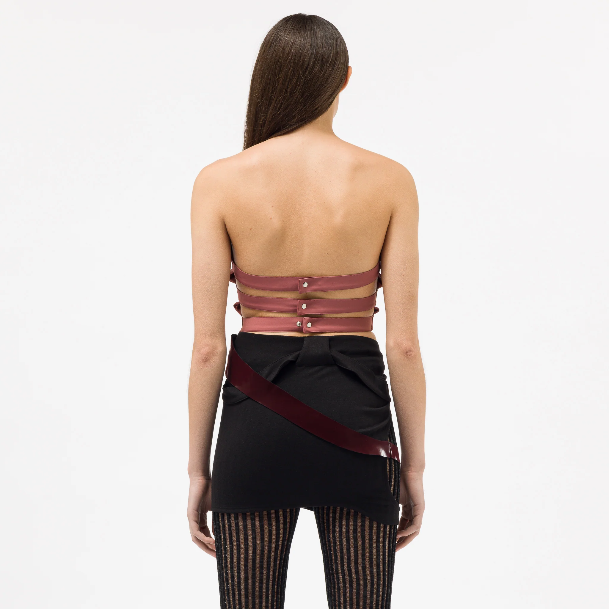 Pressiat unisex bodycon fit purple and pink stretch polyester rib knit and polyurethane corset top. Features a contrast fabric asymmetrical paneled construction, three adjustable snap-button back straps, and a wrap-around waist strap detail on the right side.