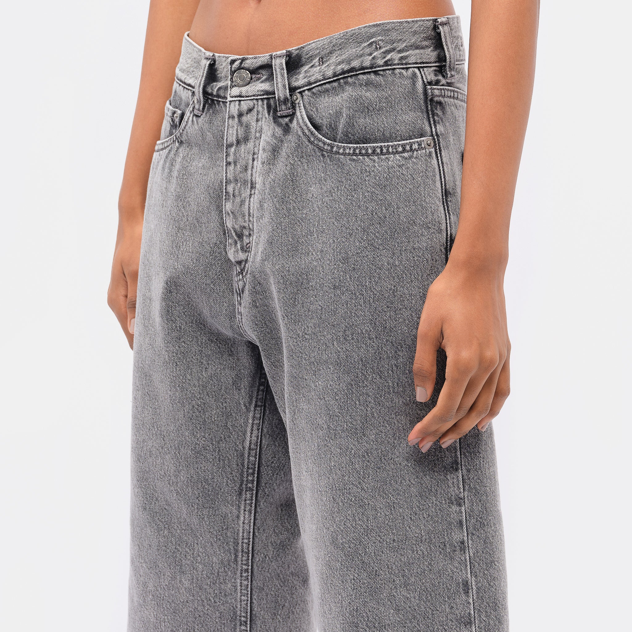 HOPE unisex relaxed fit grey 100% organic cotton 5-pocket shorts. Features a wide leg, a high rise, below-knee length, and HOPE branded buttons and trims.