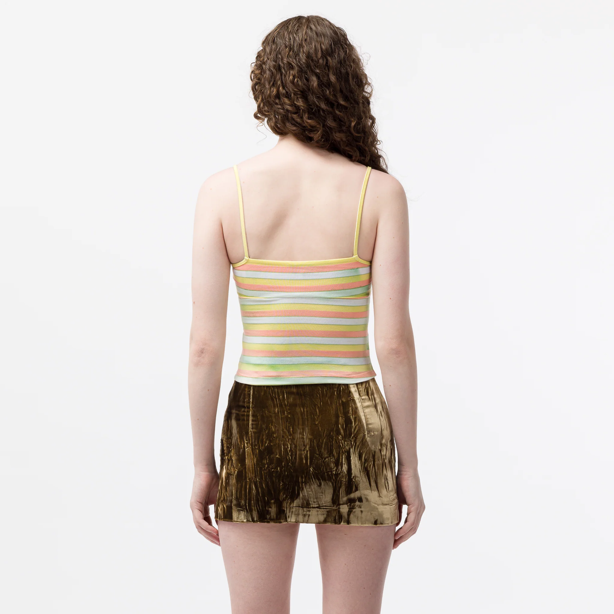 Collina Strada women’s bodycon, cropped fit “Scholastic” multicolor striped printed deadstock cotton tank top. Features a flower-shaped cut-out detail on the front, a printed striped pattern, and two adjustable spaghetti shoulder straps.