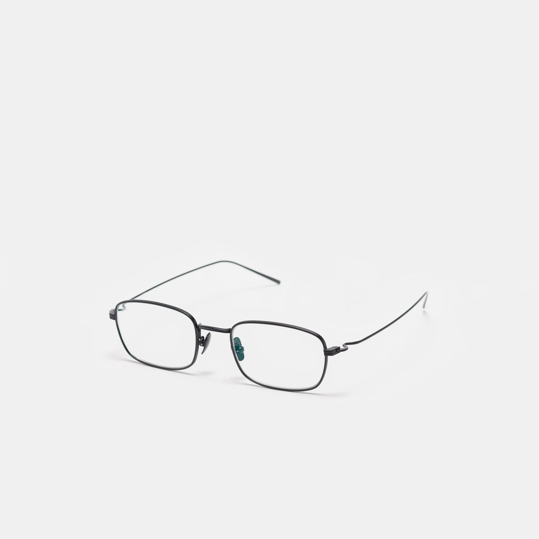 Akila Grace glasses in matte black. Featuring lightweight but durable titanium metal, clear lenses that block blue light, and adjustable nose pads.