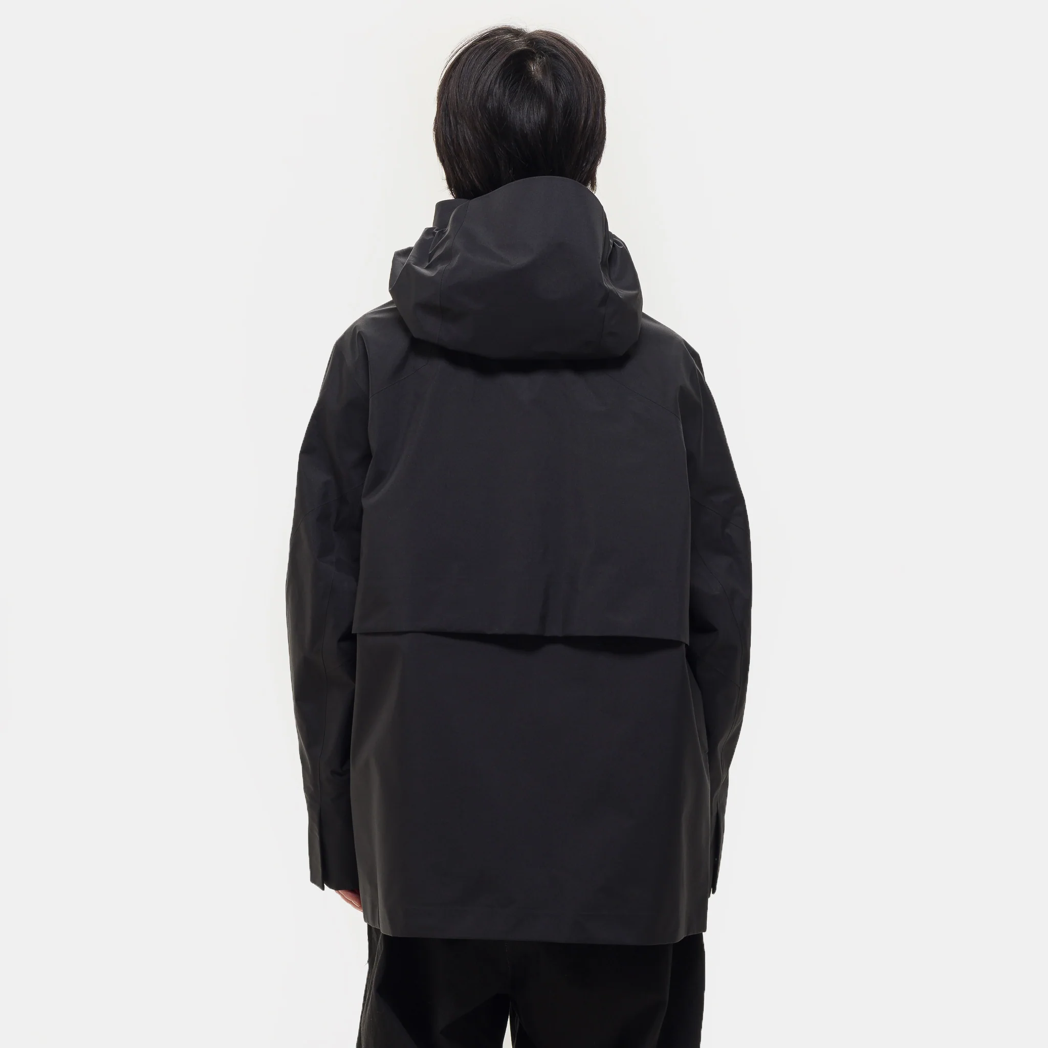 Arc'teryx Veilance jacket in black. Features oversized fit, breathable Gore C-Knit, and laminated elastic hem.