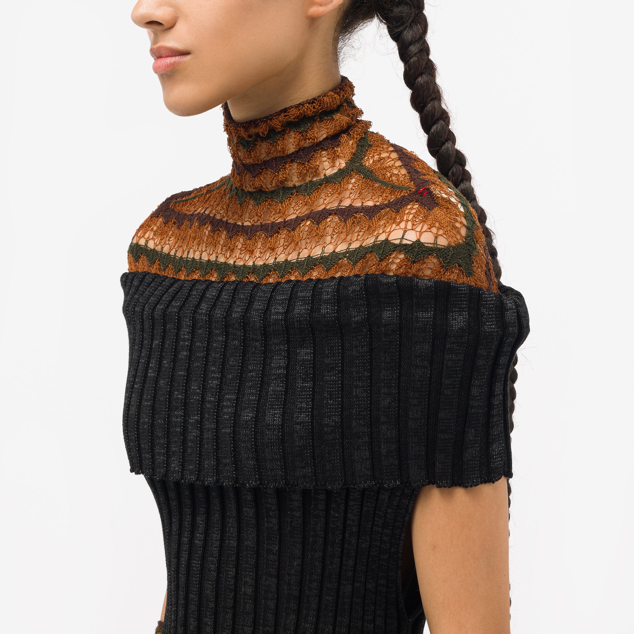 Isa Boulder women’s bodycon fit “Flame” orange, brown, and green semi-sheer stretch rayon knit short sleeve shrug top. Features an intarsia knit stripe pattern, a rib knit turtleneck collar, and includes knit gloves.