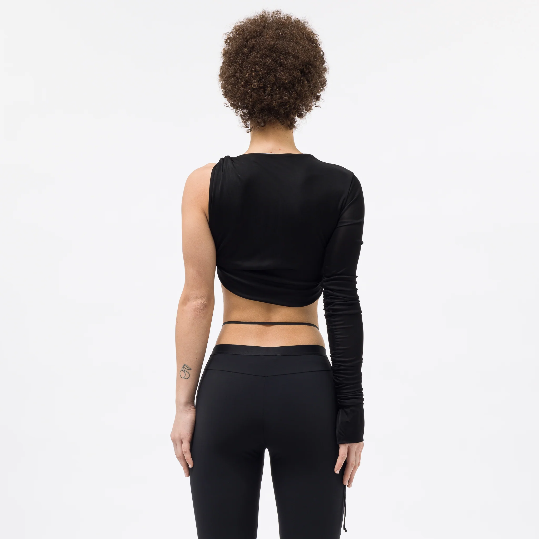 ANDREĀDAMO women’s standard, cropped fit black viscose jersey knit top. Features an asymmetrical construction with a long sleeve on the right arm that can be adjusted with a hanging tie detail.