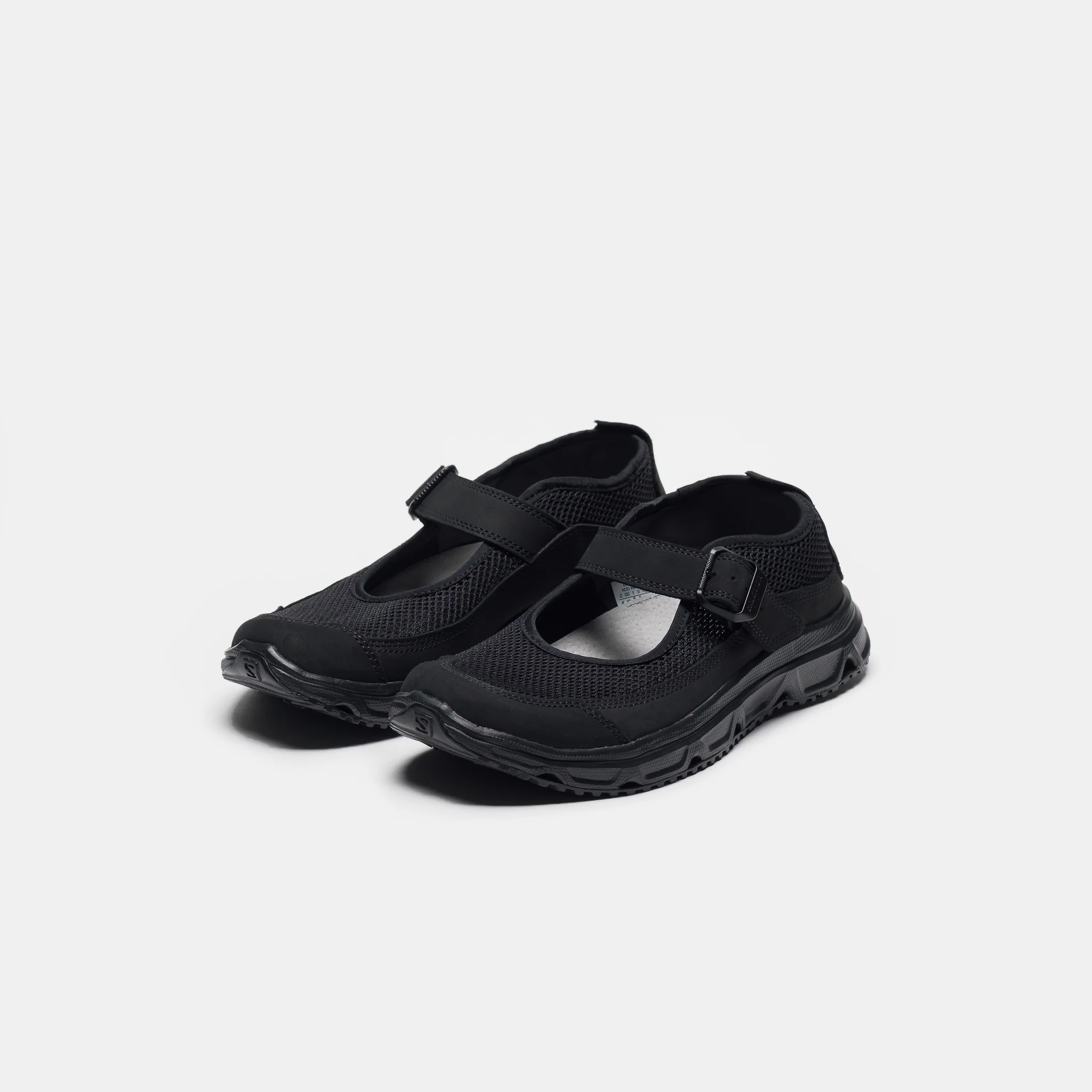 SALOMON S/LAB unisex limited edition standard black mesh slip-on low top sneaker. Designed to offer supreme comfort after outdoor activities, the RX Marie-Jeanne has a webbed strap with buckle, lightweight EVA midsole that provides energy return for tired feet, and molded EVA sockliner.