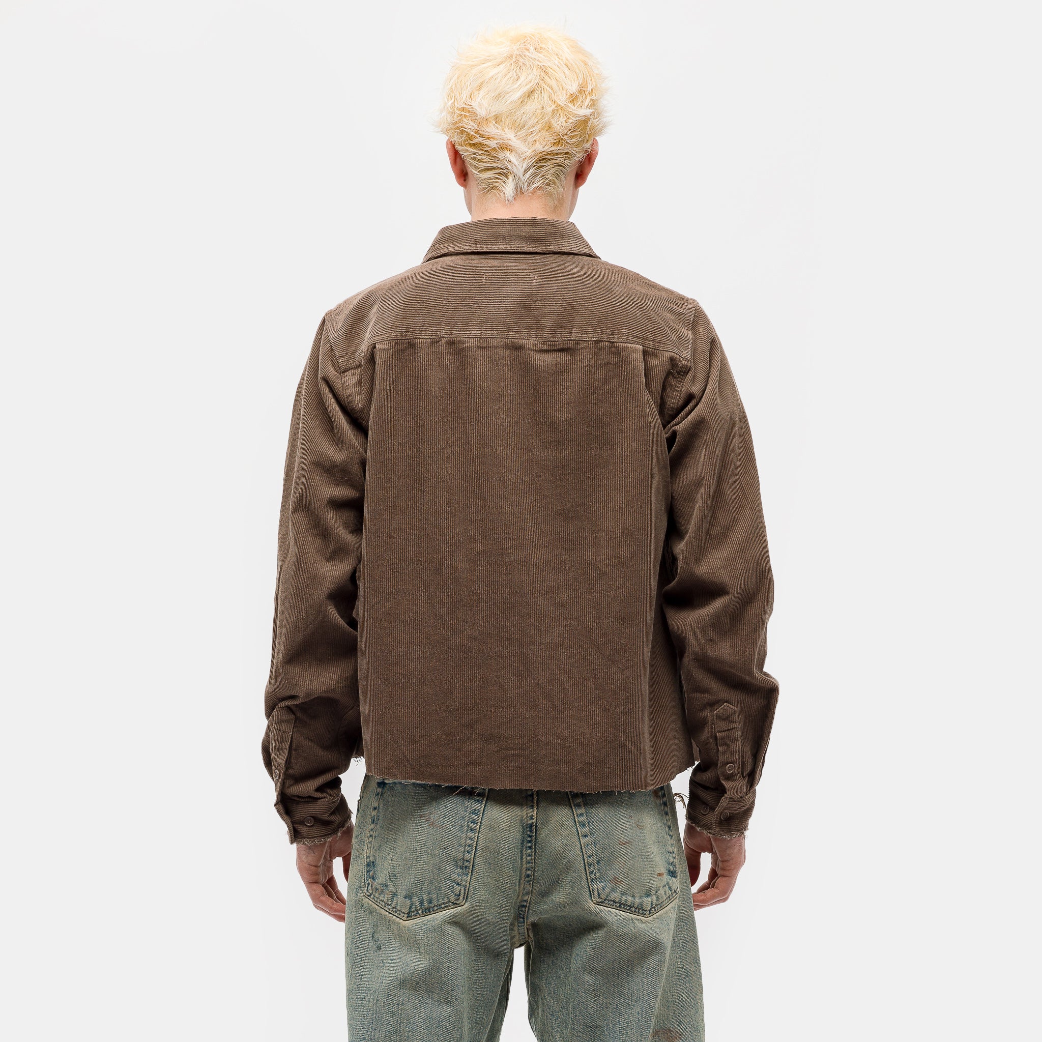 Todo Pasa men's standard fit brown corduroy button up shirt. Features distressed detailing on the collar, sleeve cuffs, and chest pockets.